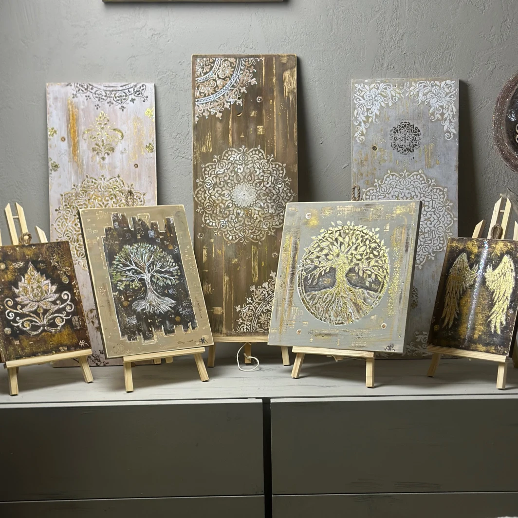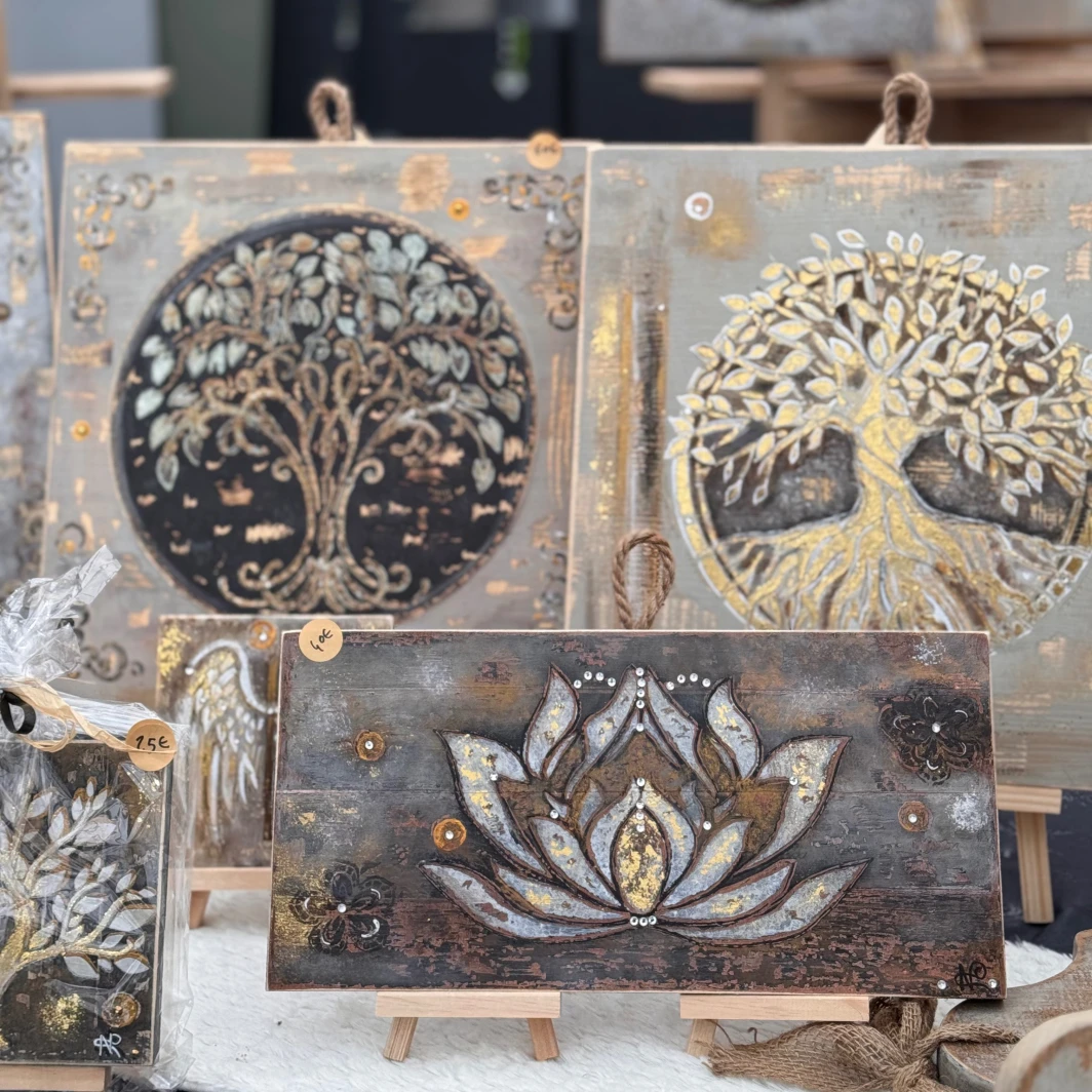 Je réalise des tableaux sur bois inspirés par le bien-être et les symboles sacrés :
